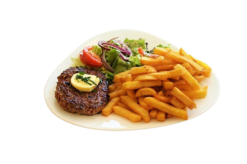 Crudité, 1 viande et 1 sauce au choix, Frites.