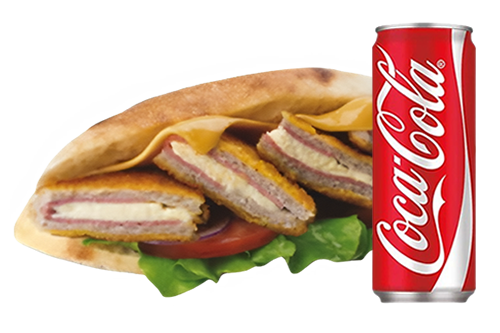 1 pain, salade, tomate, 2 sauces au choix, cordon bleu. Servi avec boisson au choix.