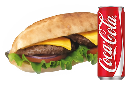 1 pain, salade, tomate, 2 sauces au choix, steak, cordon bleu et Cheddar. Servi avec boisson au choix.