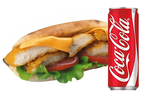 1 pain, salade, tomate, 2 sauces au choix, poulet pané. Servi avec boisson au choix.