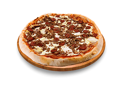 Sauce tomate, mozzarella, boursin, viande haché, oignons.